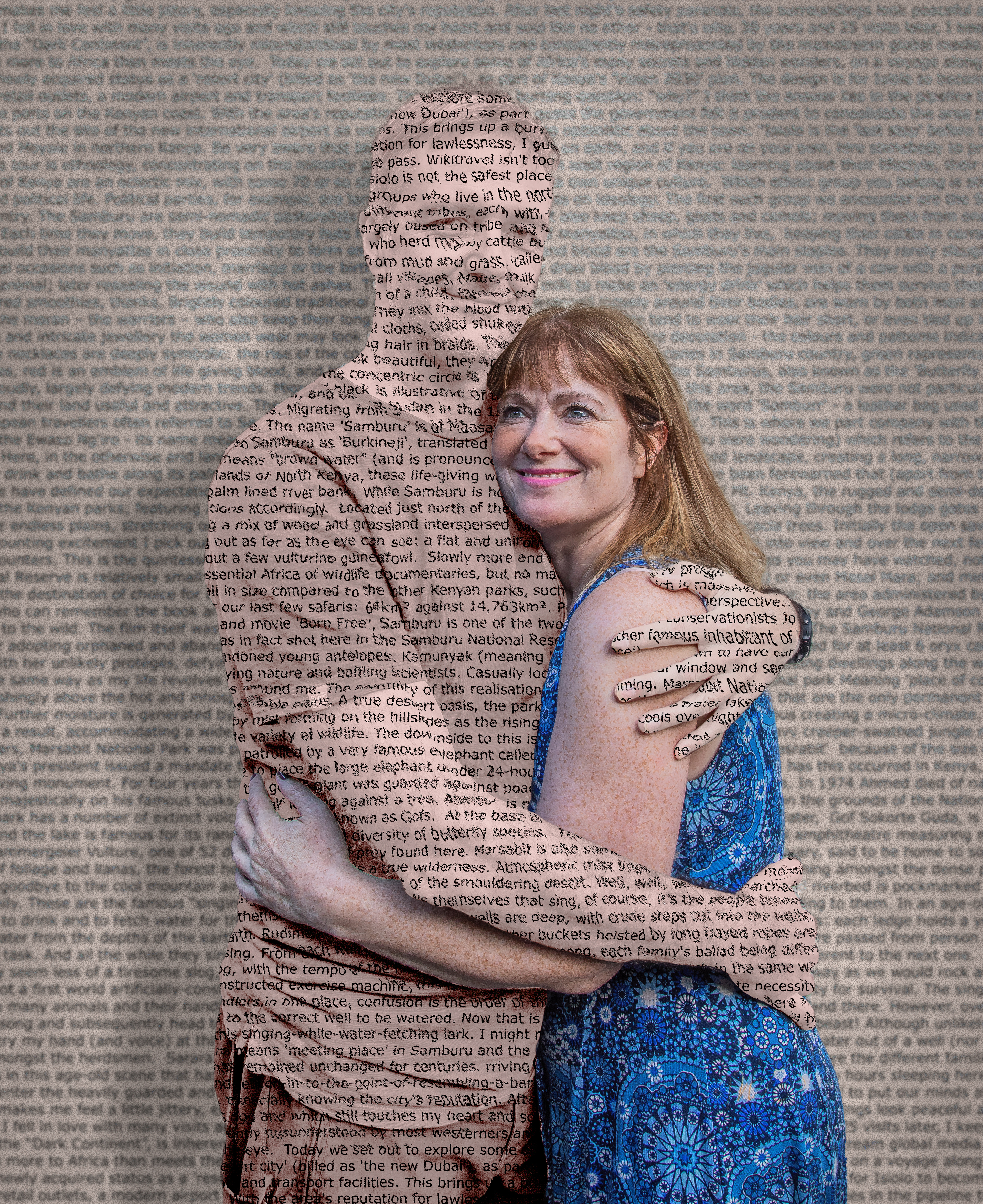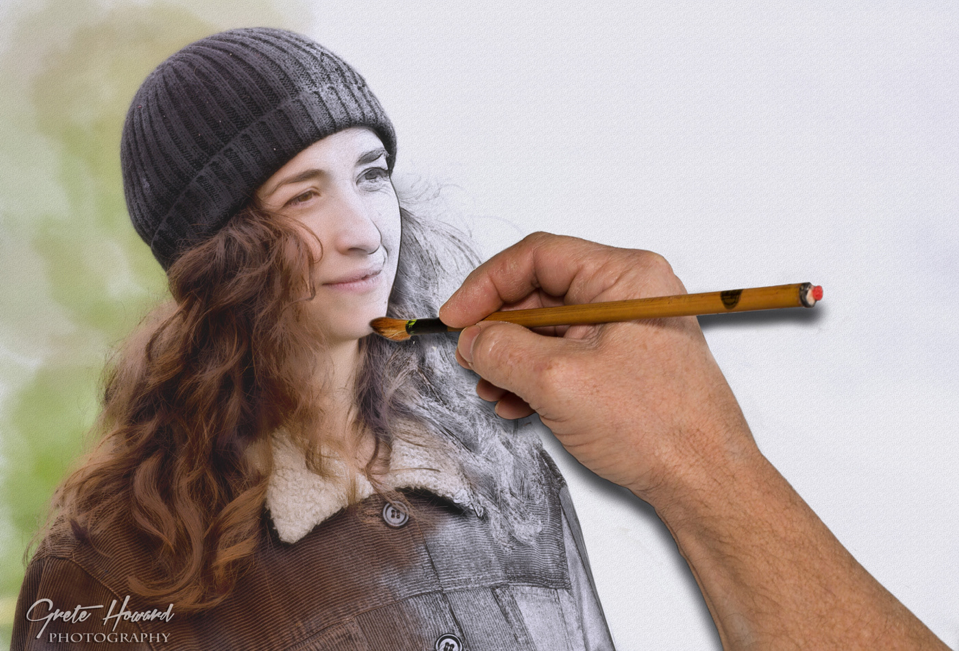 Created by taking two images - one with Francesca resting atop a stepladder, and one with just the background without Francesca in it; then combine the two in Photoshop.