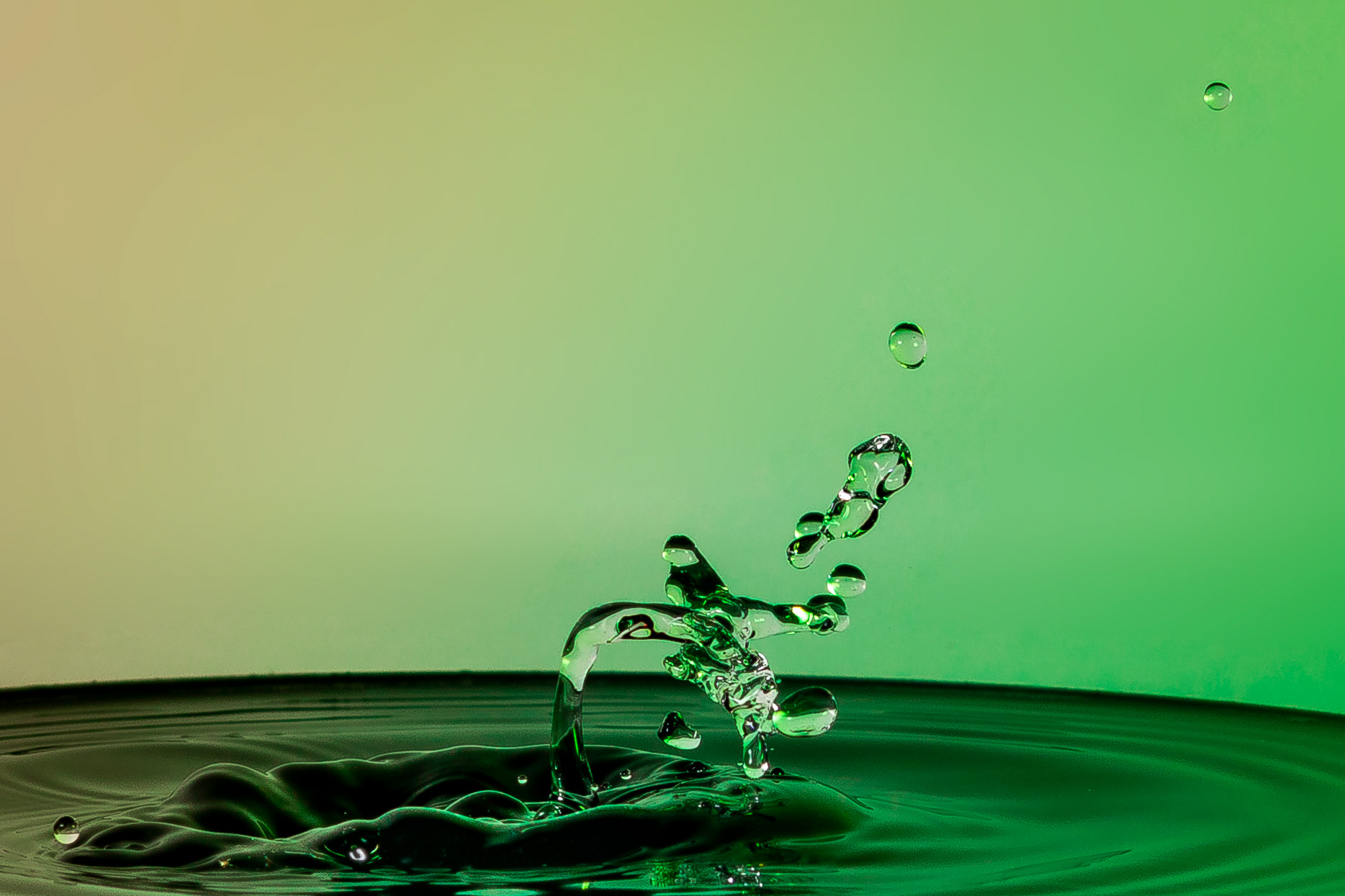For my next session I wanted to try and create some little crowns, so set up my dripper to land on a sheet of black plexiglass with a white card as background. I added green food colouring to the dripping water, a drop of yellow on the glass for the drop to splash onto, and a peach coloured gel to one of the flash guns. This resulted in a couple of very interesting images.