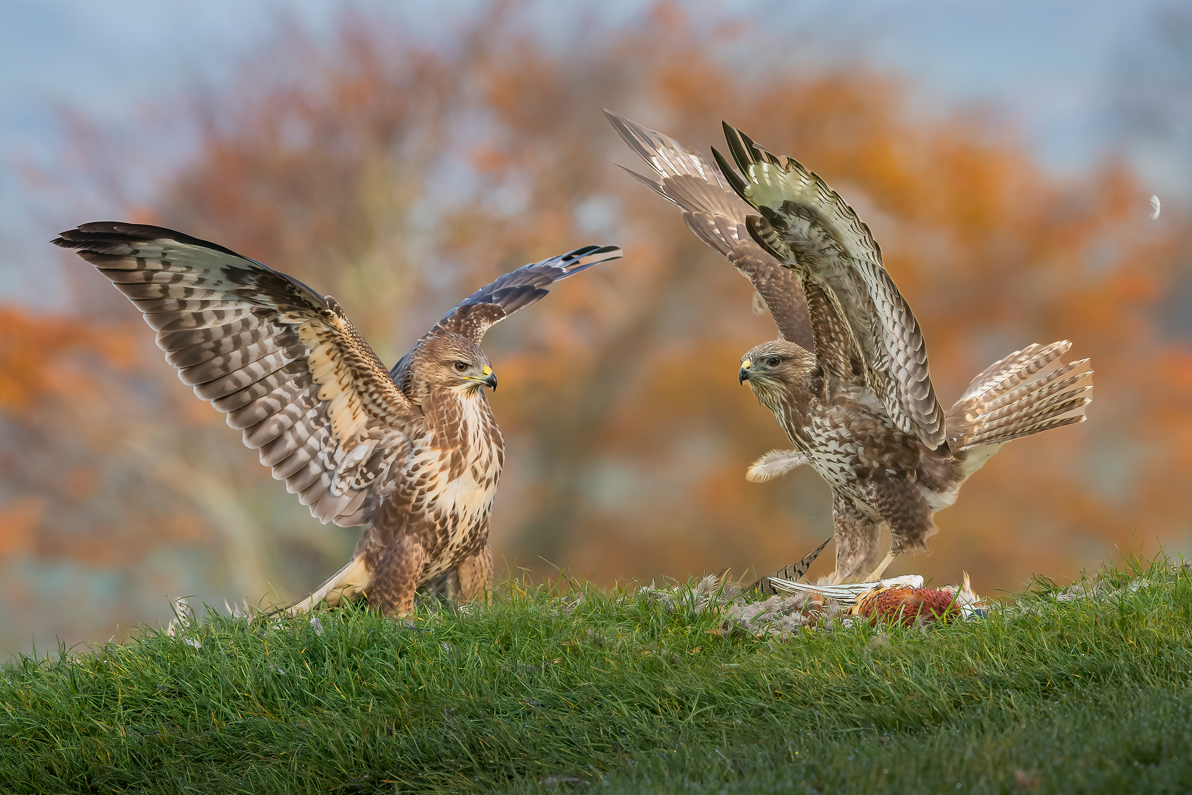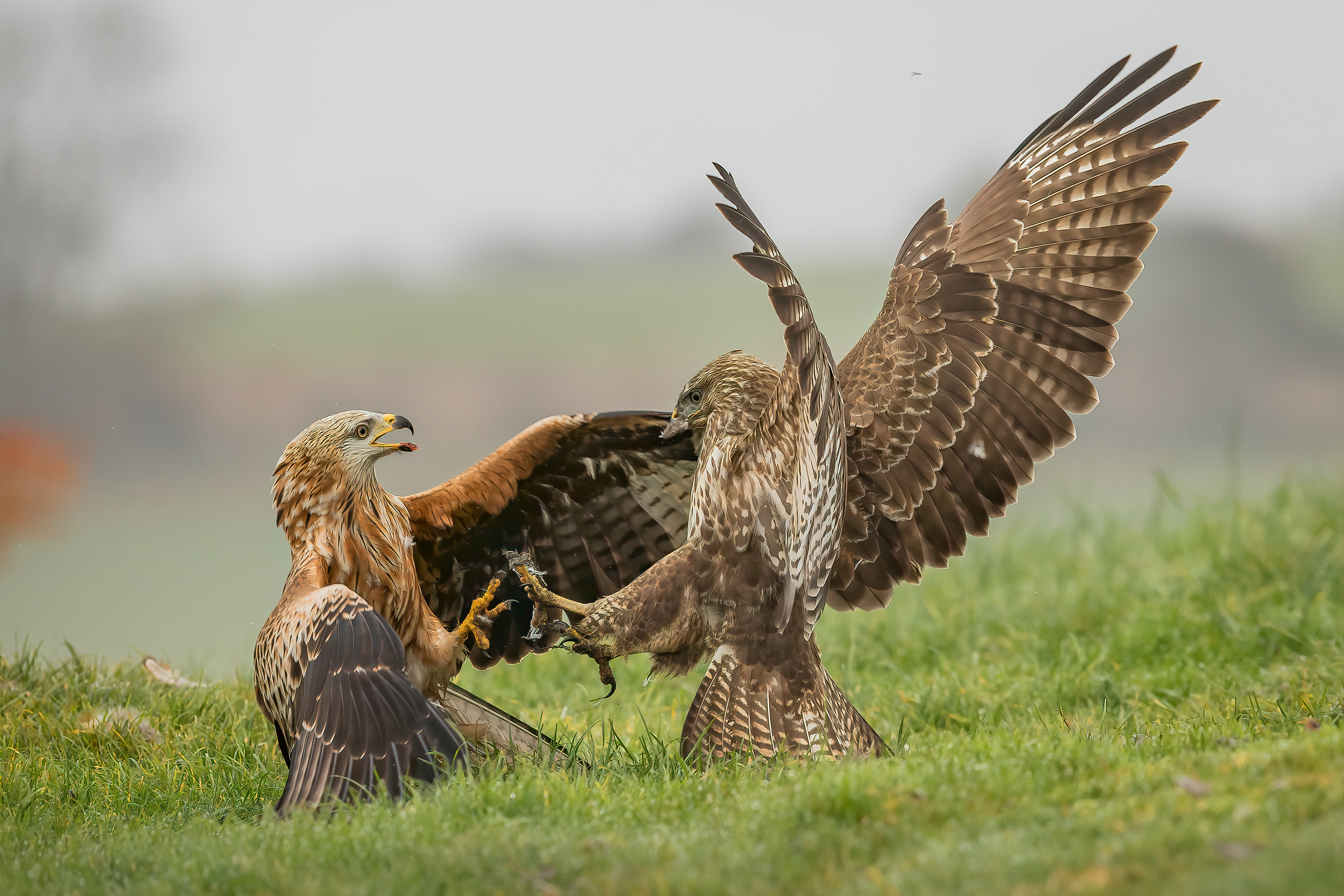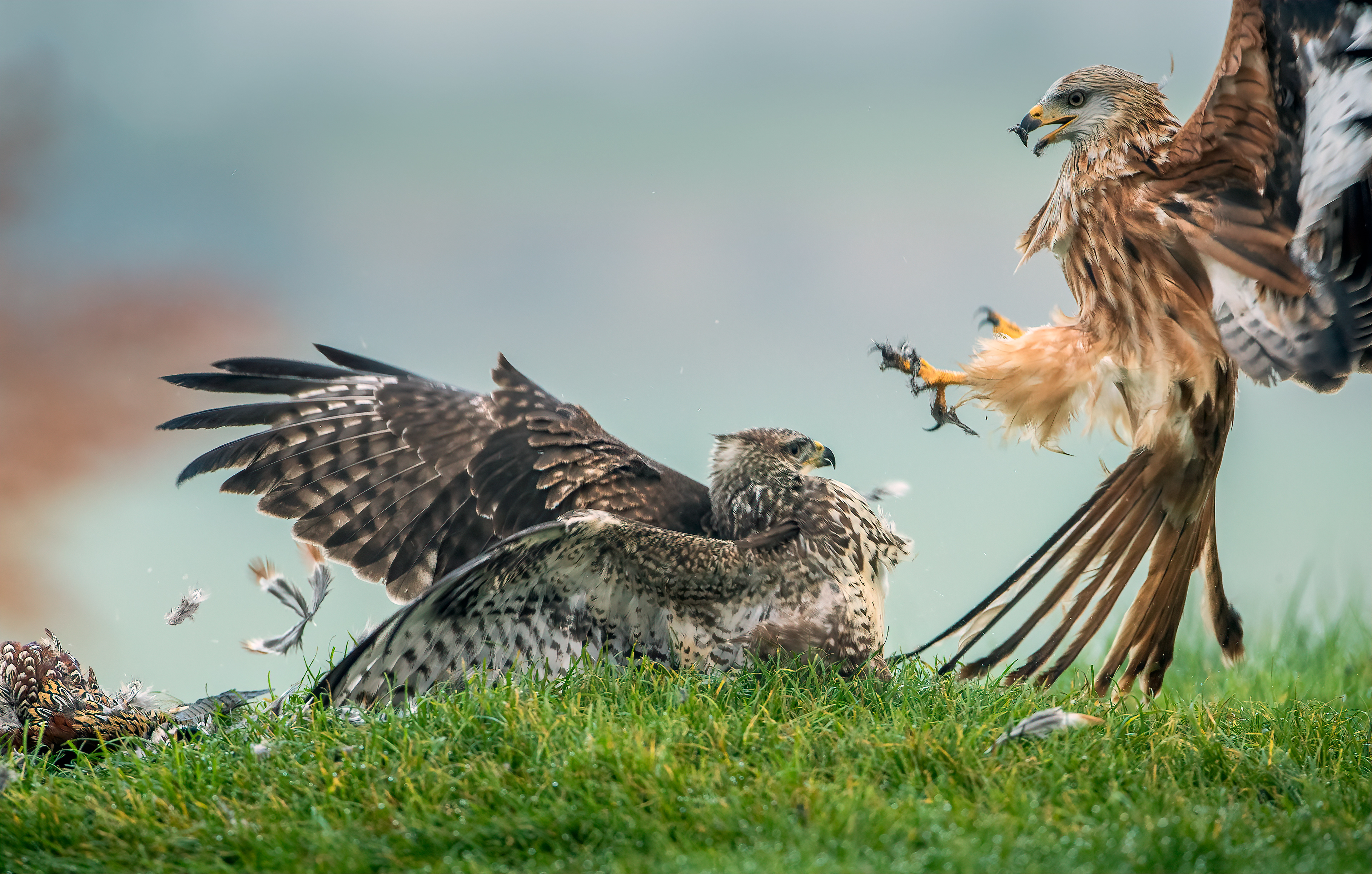 Feathers fly as the buzzard sees off the kite.