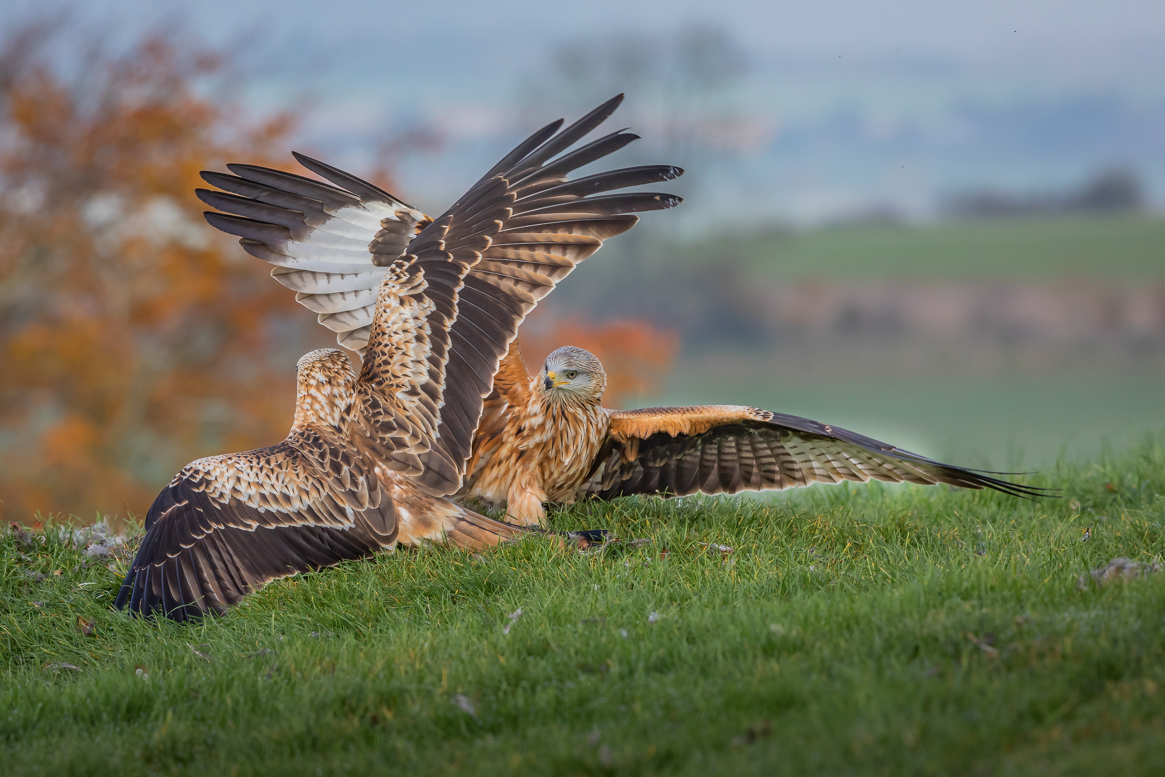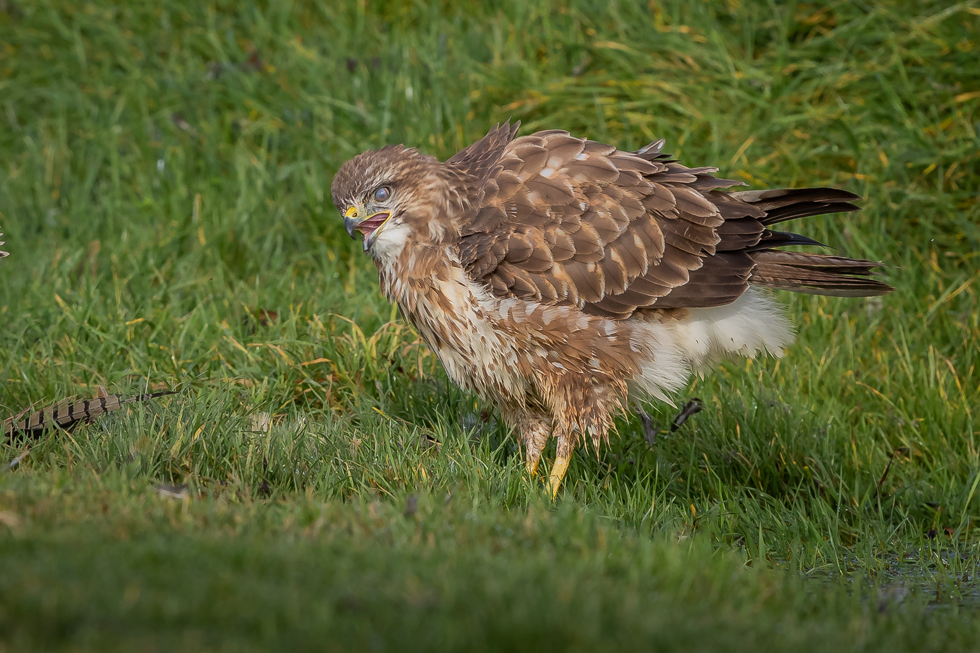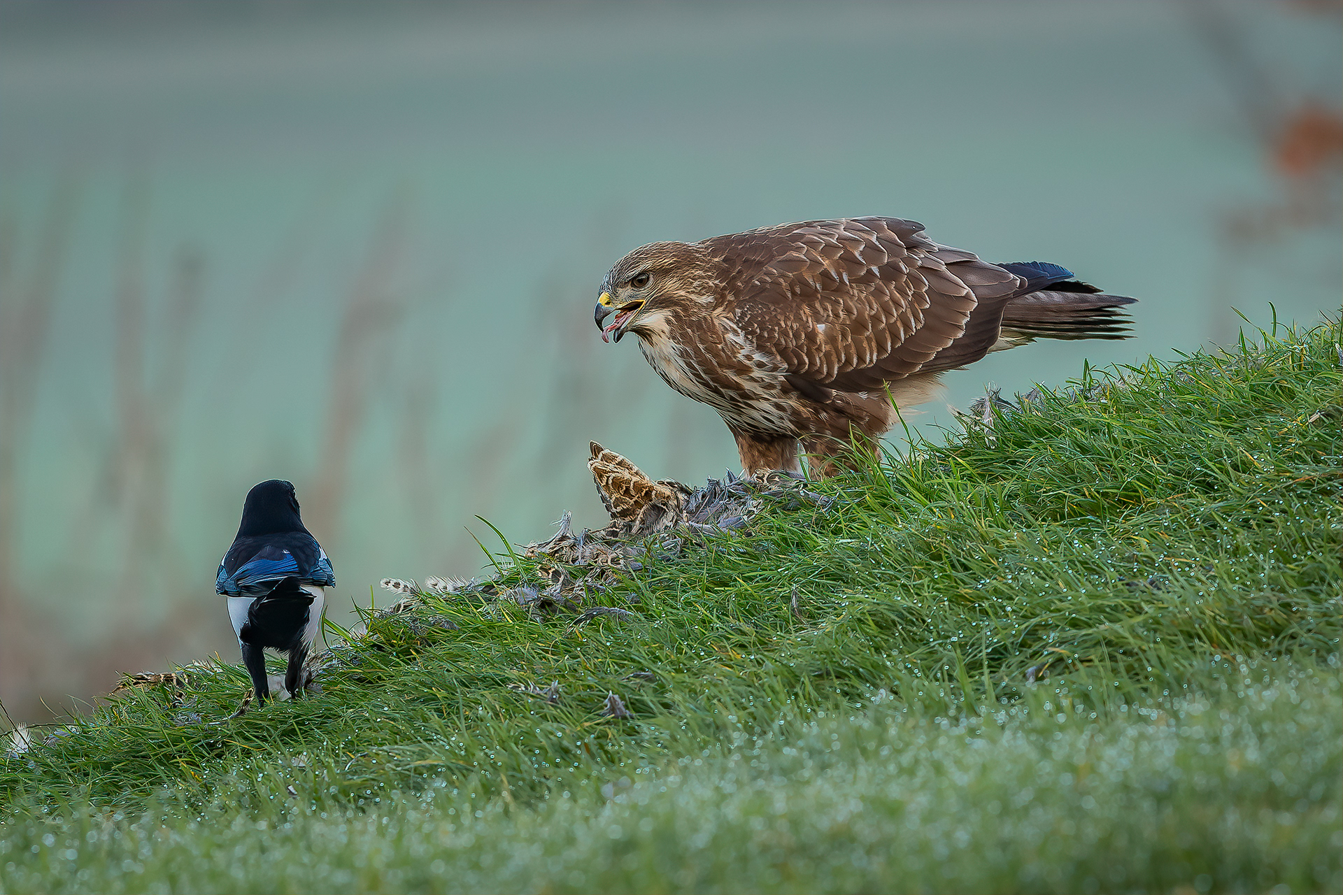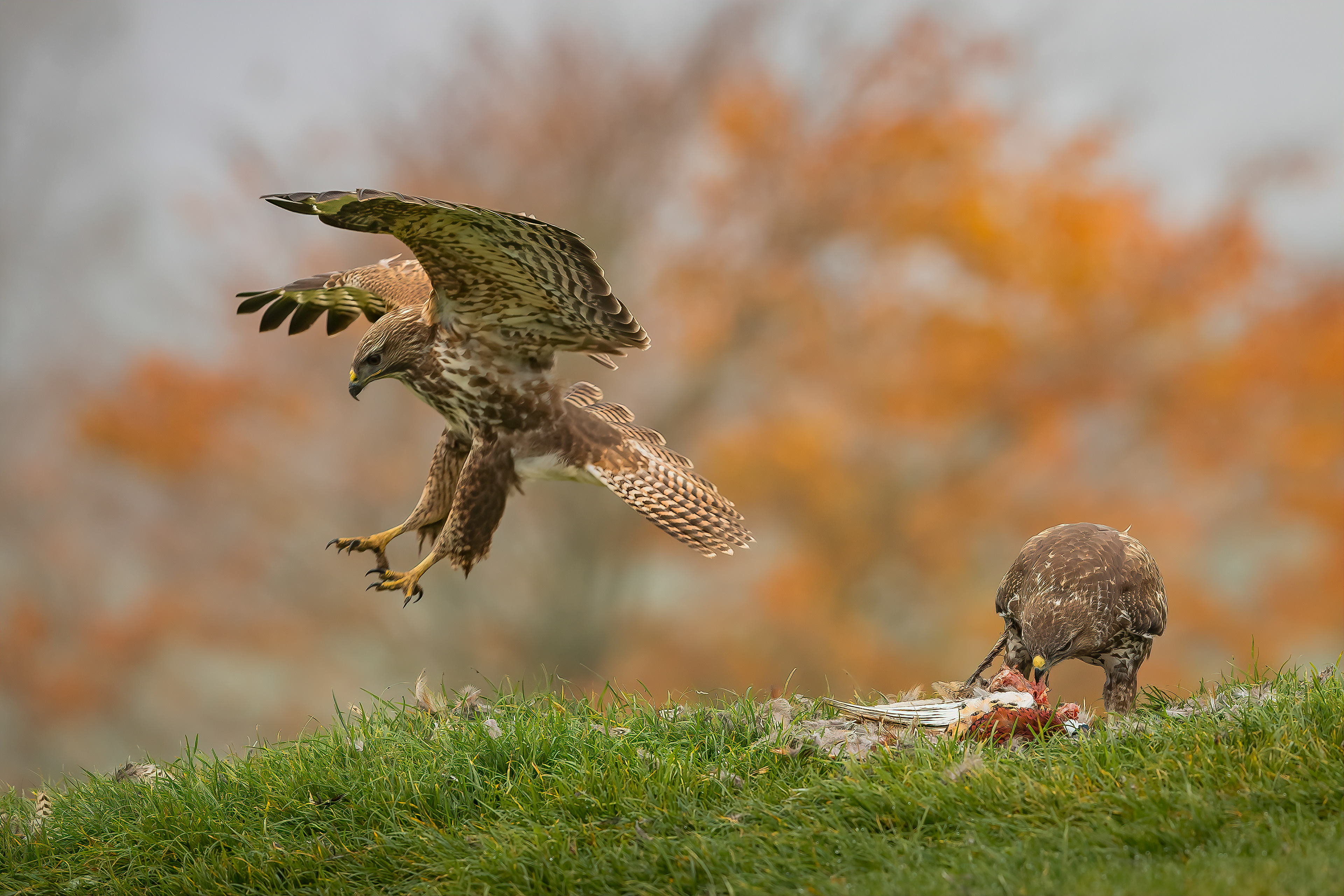 Feathers fly as the buzzard sees off the kite.