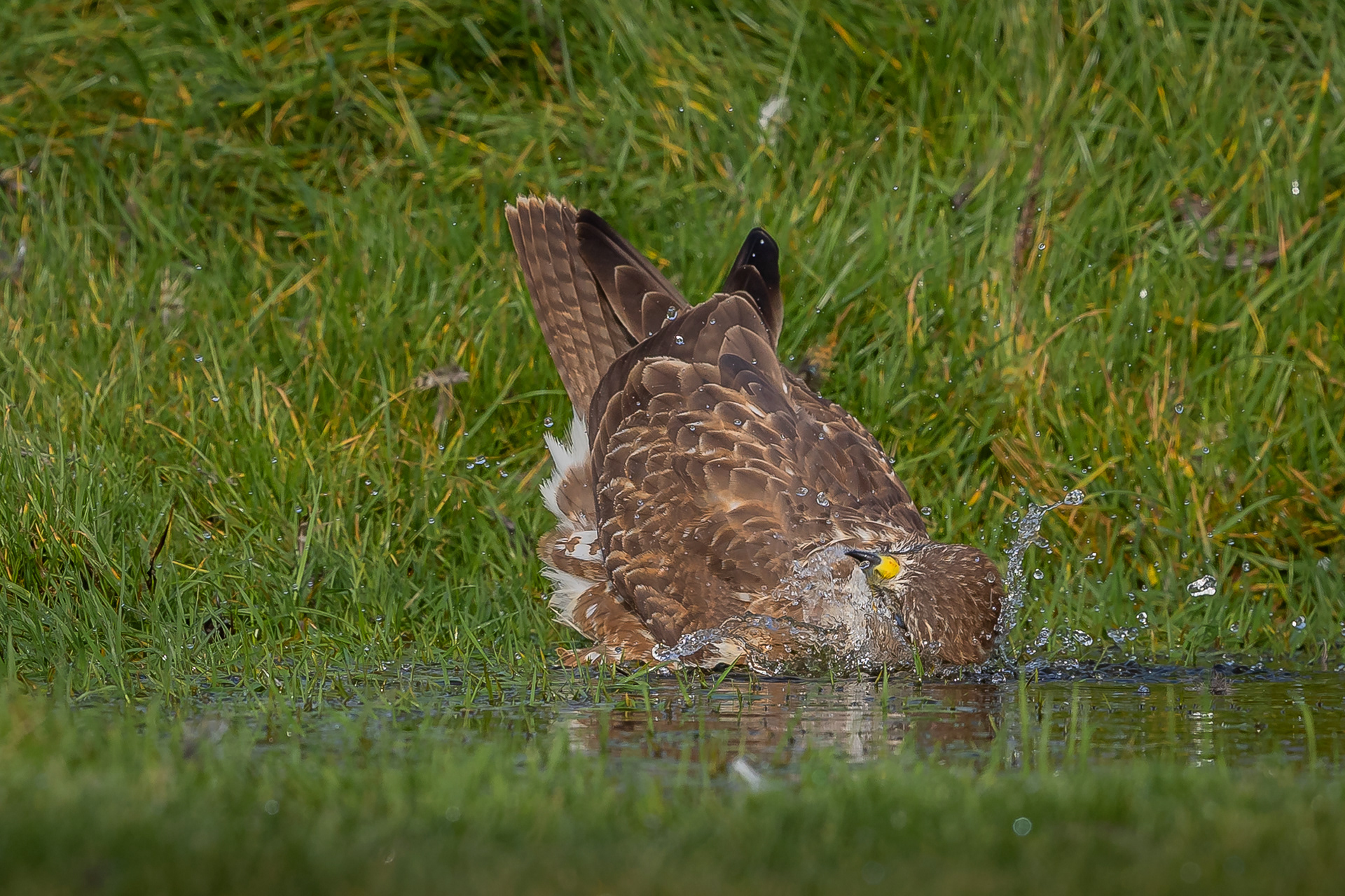 A buzzard taking a bath in a small pond.
