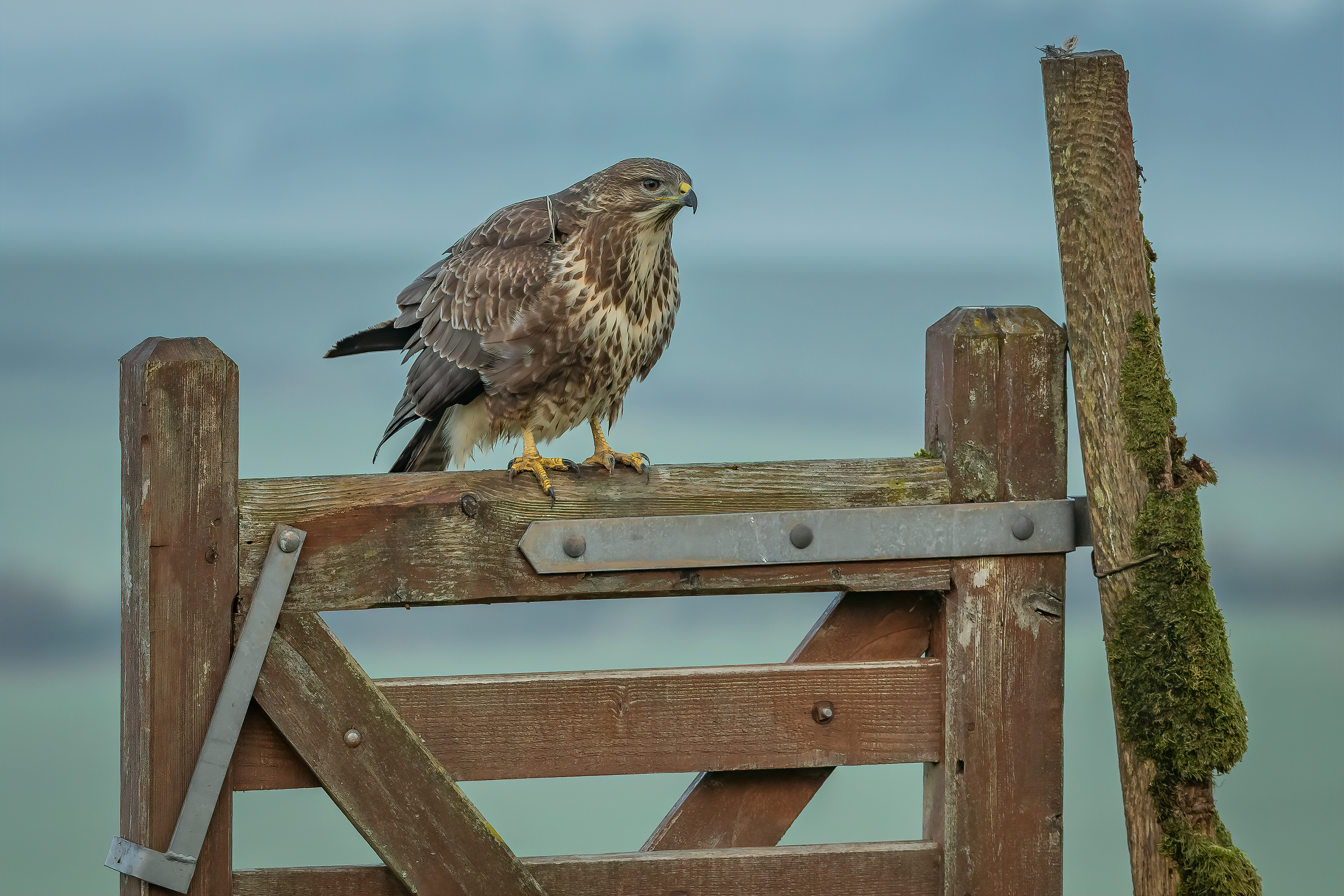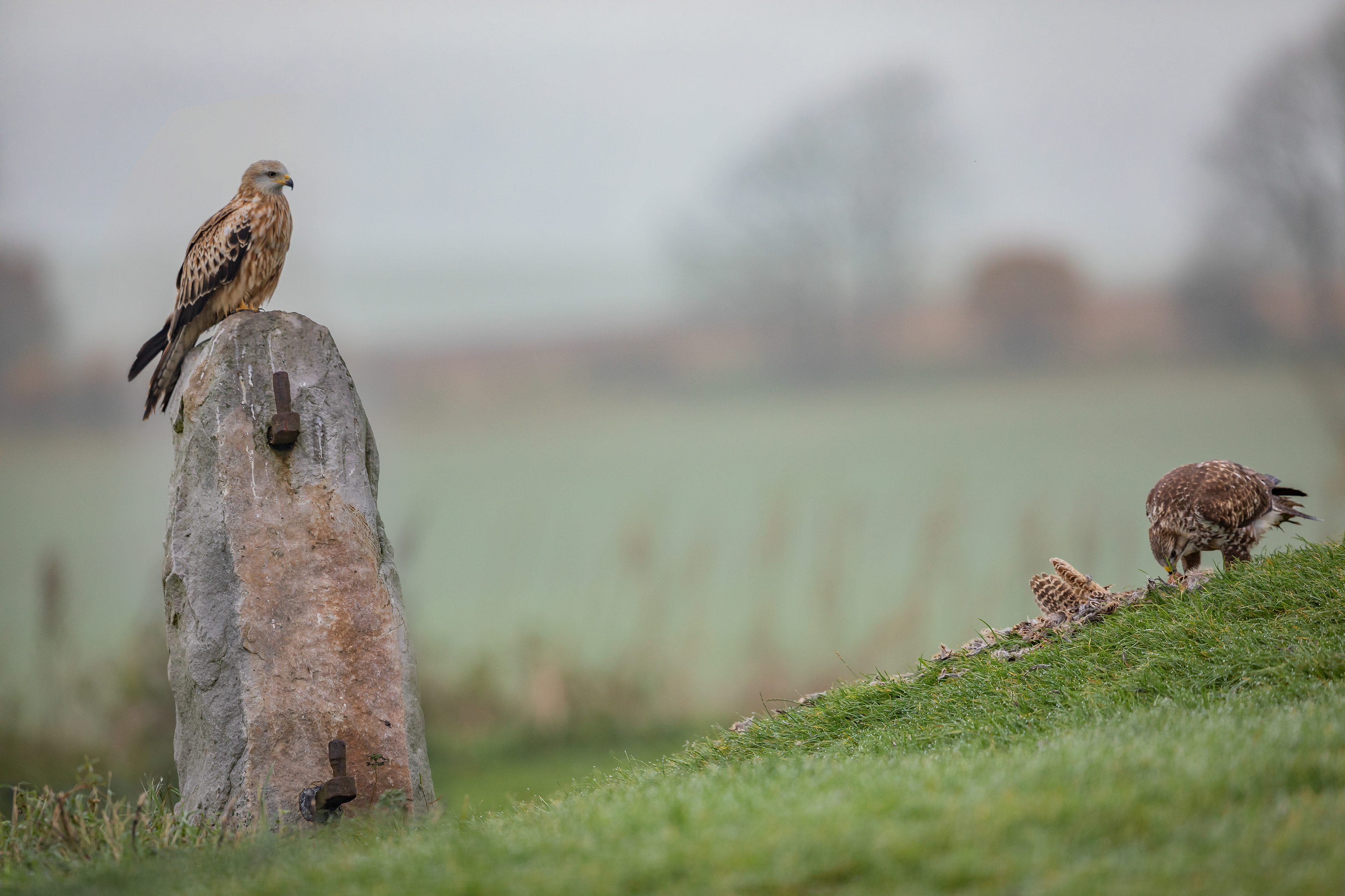 Pre-dawn mist. The first of many buzzards to arrive.