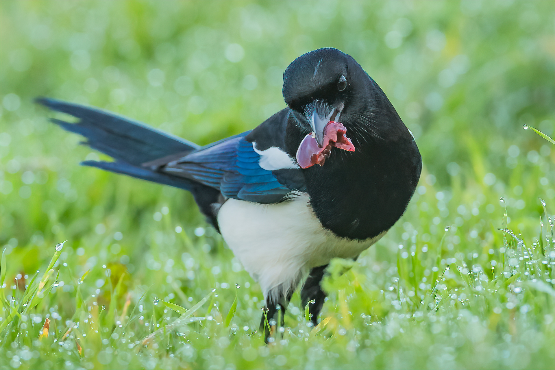 A cheeky magpie seizes an opportunity to steal a tasty morsel of meat.
