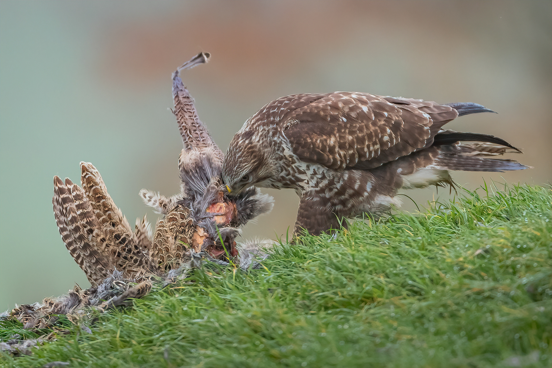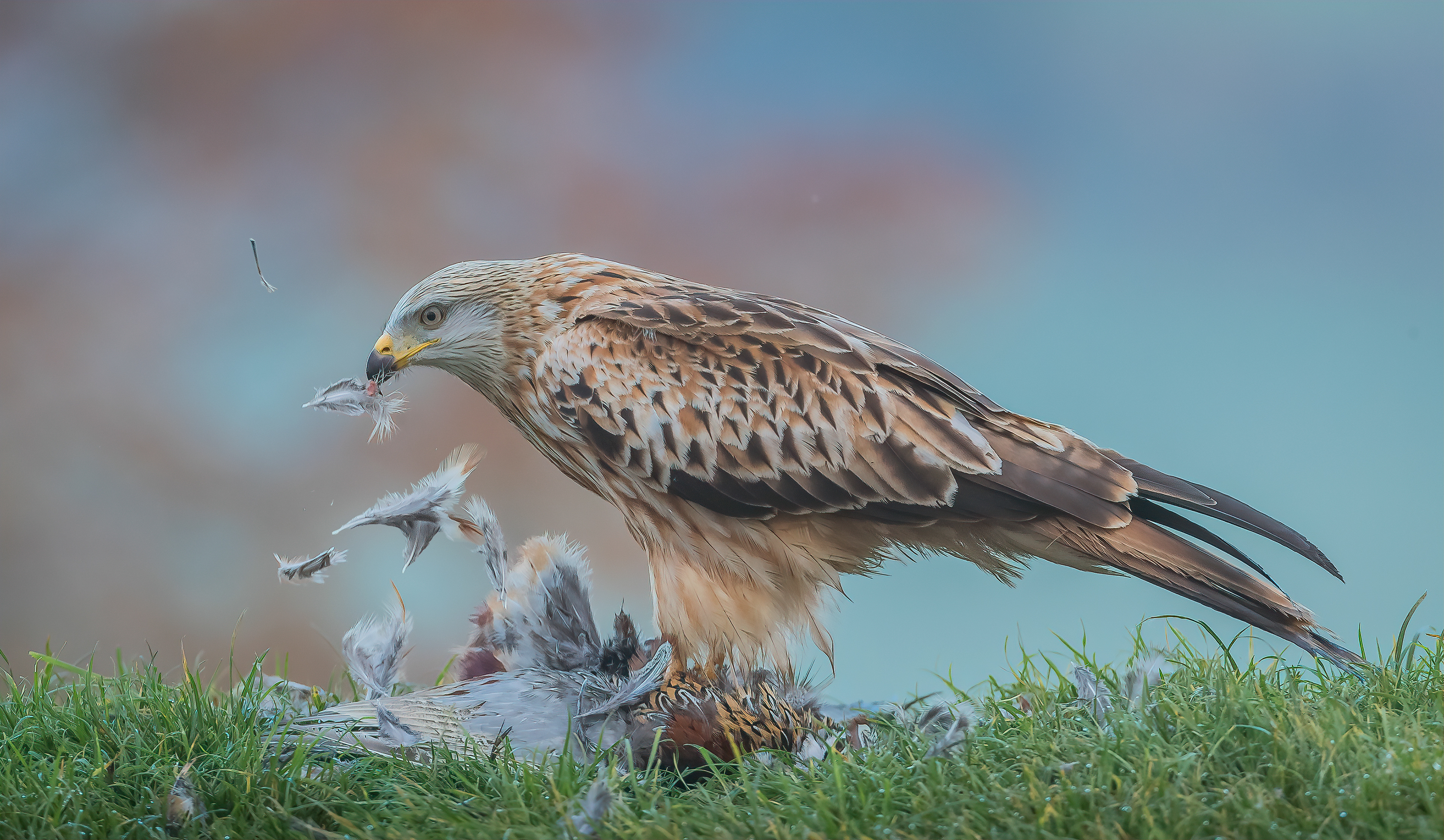 A red kite spitting feathers as he plucks the pheasant ready to eat.